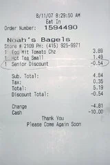 As I received my cup of hot water and took a seat to wait for my bagel, I glanced at the receipt (at left)…only to find that I had received a 10% (54-cent) “Senior Discount!”