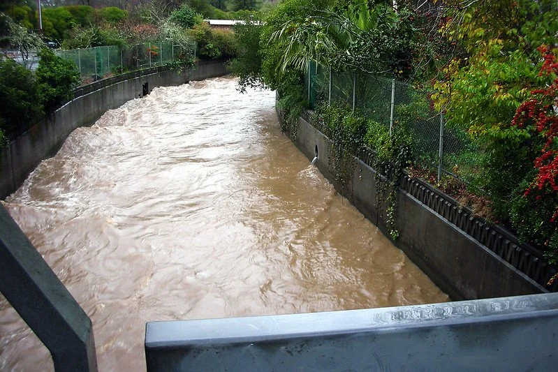 The photo above is of Corte Madera Creek coursing its way through the College of Marin (Kentfield, CA) campus last Friday. This stream is usually a mere trickle but, on this day, it was a muddy, debris-laden, roaring force of nature.