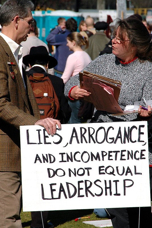 I’m including a photo here that I’ve been hoping to use in an entry sometime soon, so I’ll take this opportunity to post it now. I took this shot during a peace demonstration in Portland last March, and have entitled it “On Leadership.” It seems to me that the message sums up a lot of what’s wrong with this country: from the occupant of the White House, to leaders we experience on the local level, to those in our own work organizations. Any thoughts?