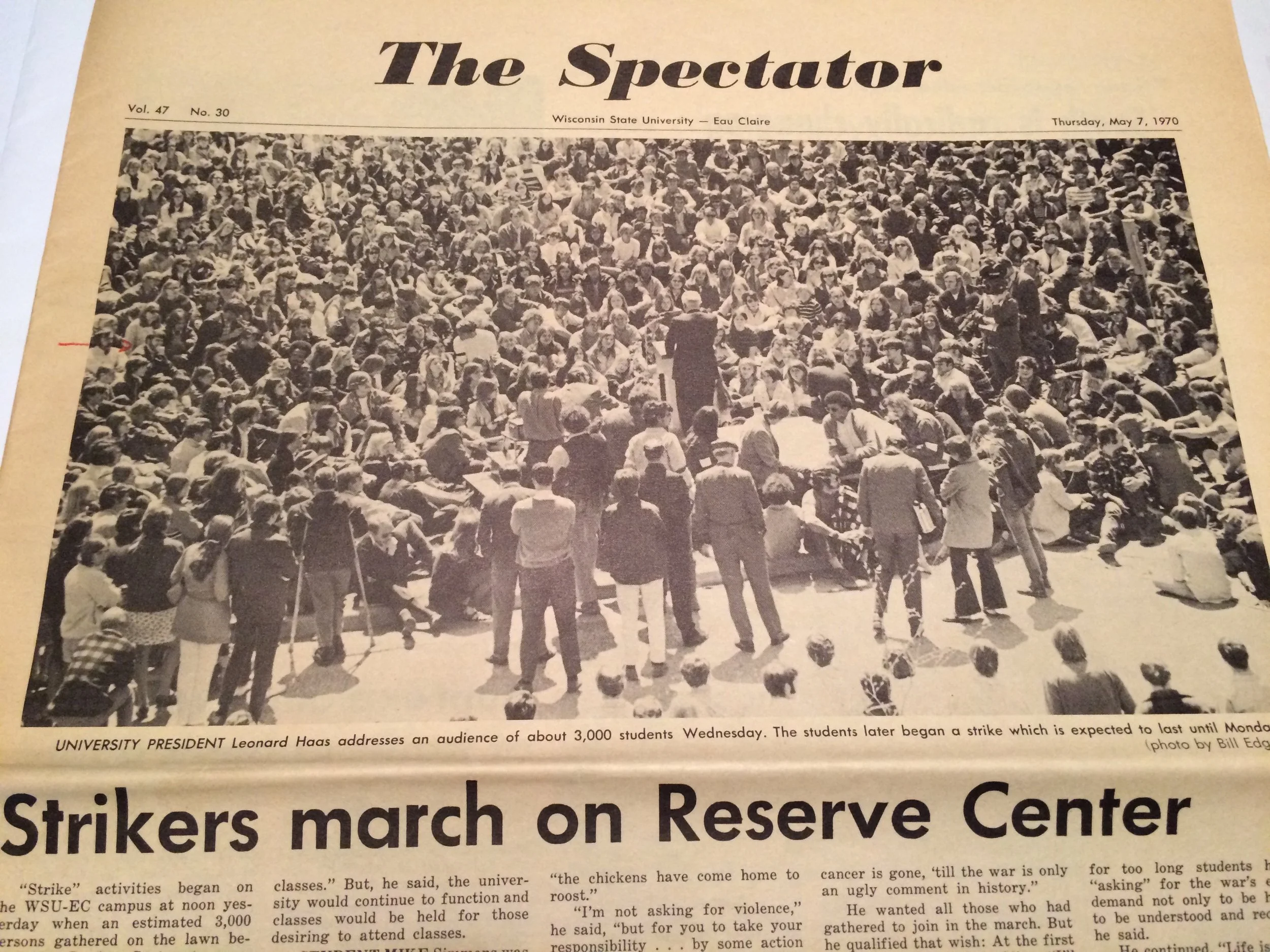 From my personal file cabinet. Front page of UW-EC student newspaper “The Spectator” - published May 7, 1970. University President Leonard Haas addresses the Kent State demonstration in the middle of campus. The little red arrow on the left-hand side of the page points to me in the crowd. (Click for enlarged version.)
