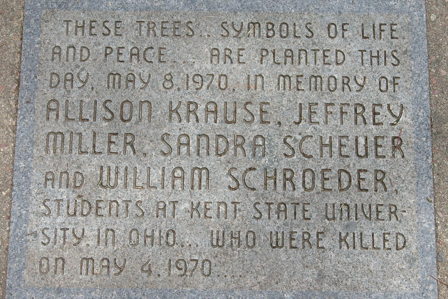 TODAY, happily, after enduring five years of uncertainty about the status of the Kent State Memorial, I am here to report a significant new development. I recently received notice (see below) from UW-EC that on May 4th, tomorrow, a new memorial will be dedicated. The old memorial consisted of four crab-apple trees and a plaque. The word is that tomorrow’s event will unveil a memorial also consisting of four crab-apple trees and a plaque (though not the original one pictured above). I am sad that I cannot be there to participate in the event, but very pleased that there will be a new Kent State Memorial to get acquainted with during my next trip to campus.