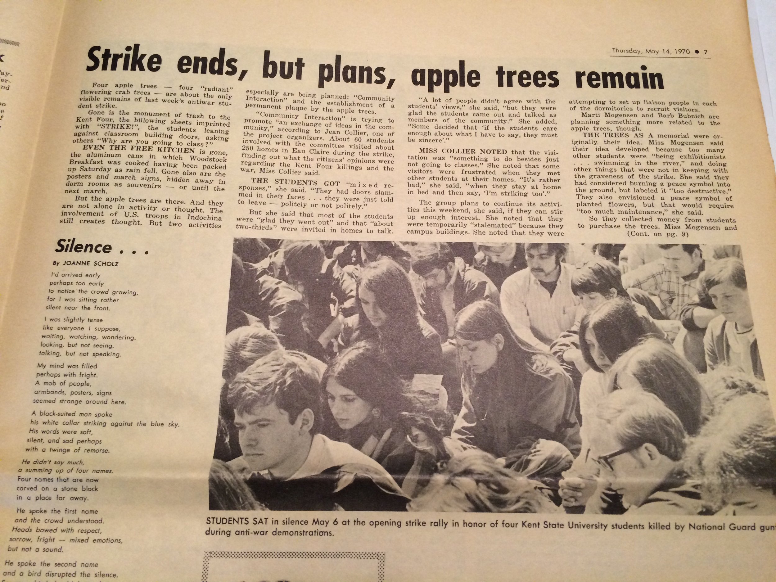 From my personal file cabinet. UW-EC student newspaper “The Spectator” - published May 14, 1970. Continuing coverage of the Kent State demonstrations and the days that followed, including the dedication of a memorial: four crab-apple trees and a plaque planted in the ground by the student center building to forever remember the slain students. That’s me, at age 22, in the top left-center of the photo - taken during the May 6th demonstration. (Click for enlarged version.)