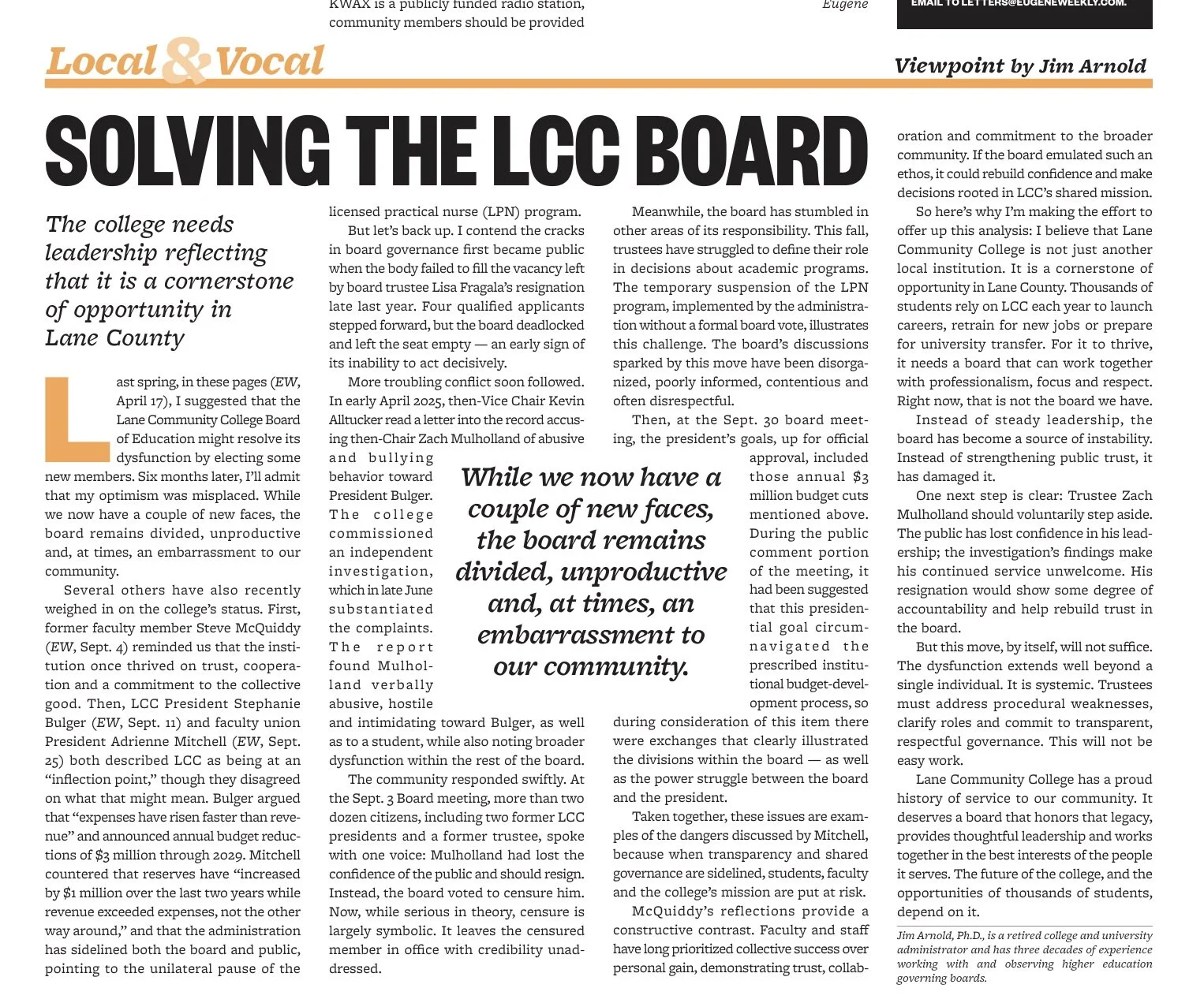 Last spring (EW, April 16) I wrote that the Lane Community CollegeBoard of Education had become dysfunctional and needed new voices. When I followed up just recently (EW, October 9), I had hoped to report progress. I couldn’t. The same divisiveness remains and the stakes have only grown.